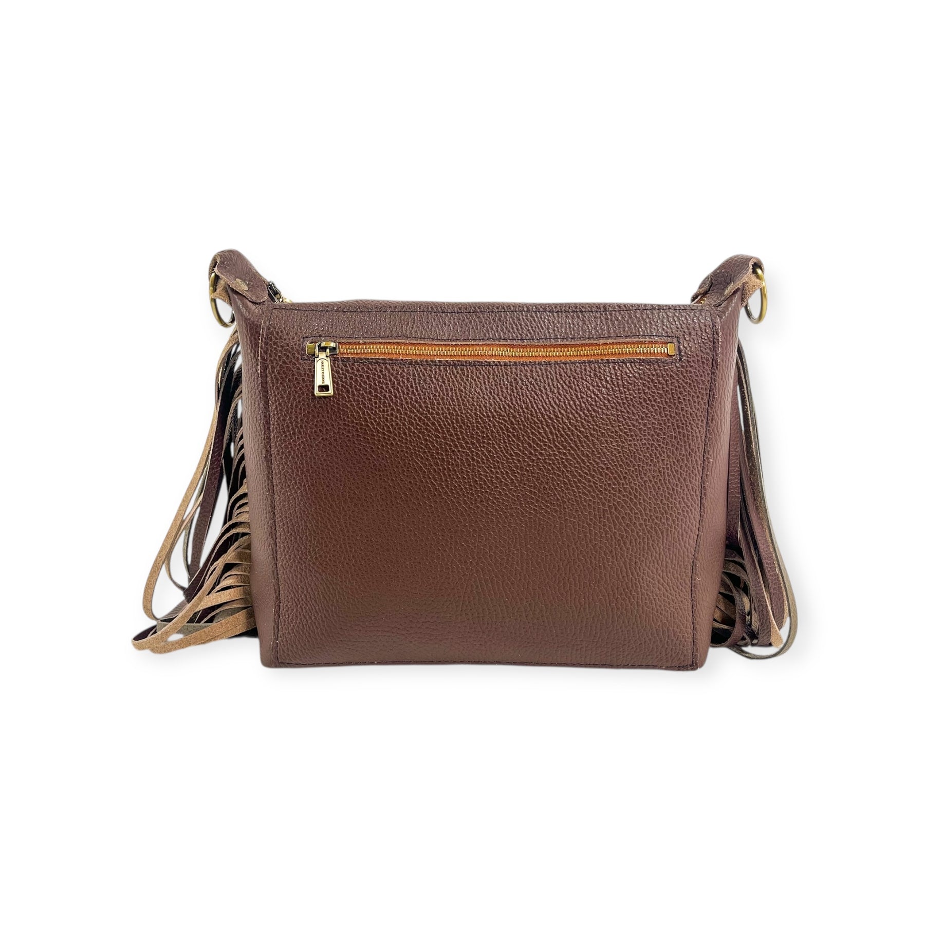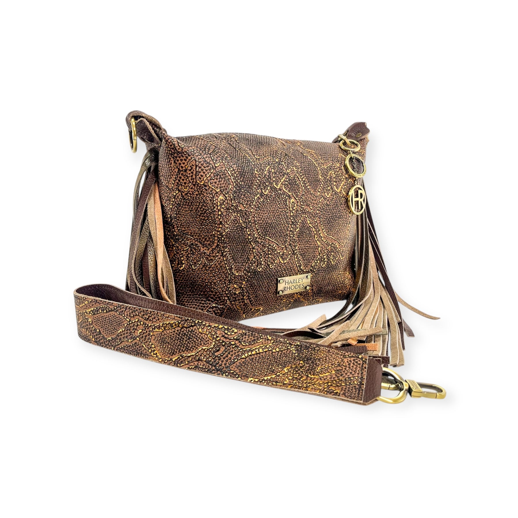 This Annie Shoulder Bag features Espresso Metallic Snake Print Embossed Leather front, HarleQue Taupe Spandex interior liner and Fringe, with Brushed Brass hardware.