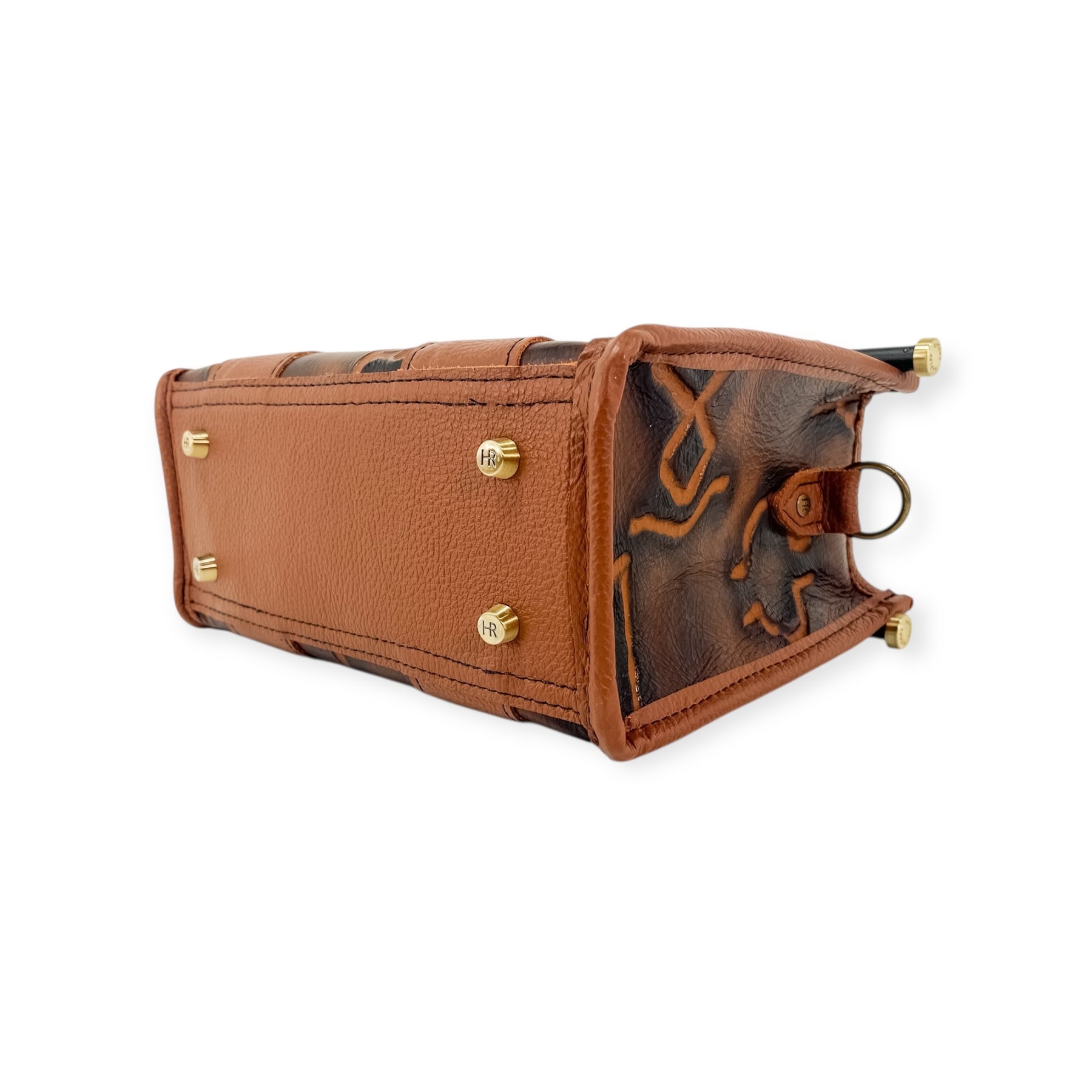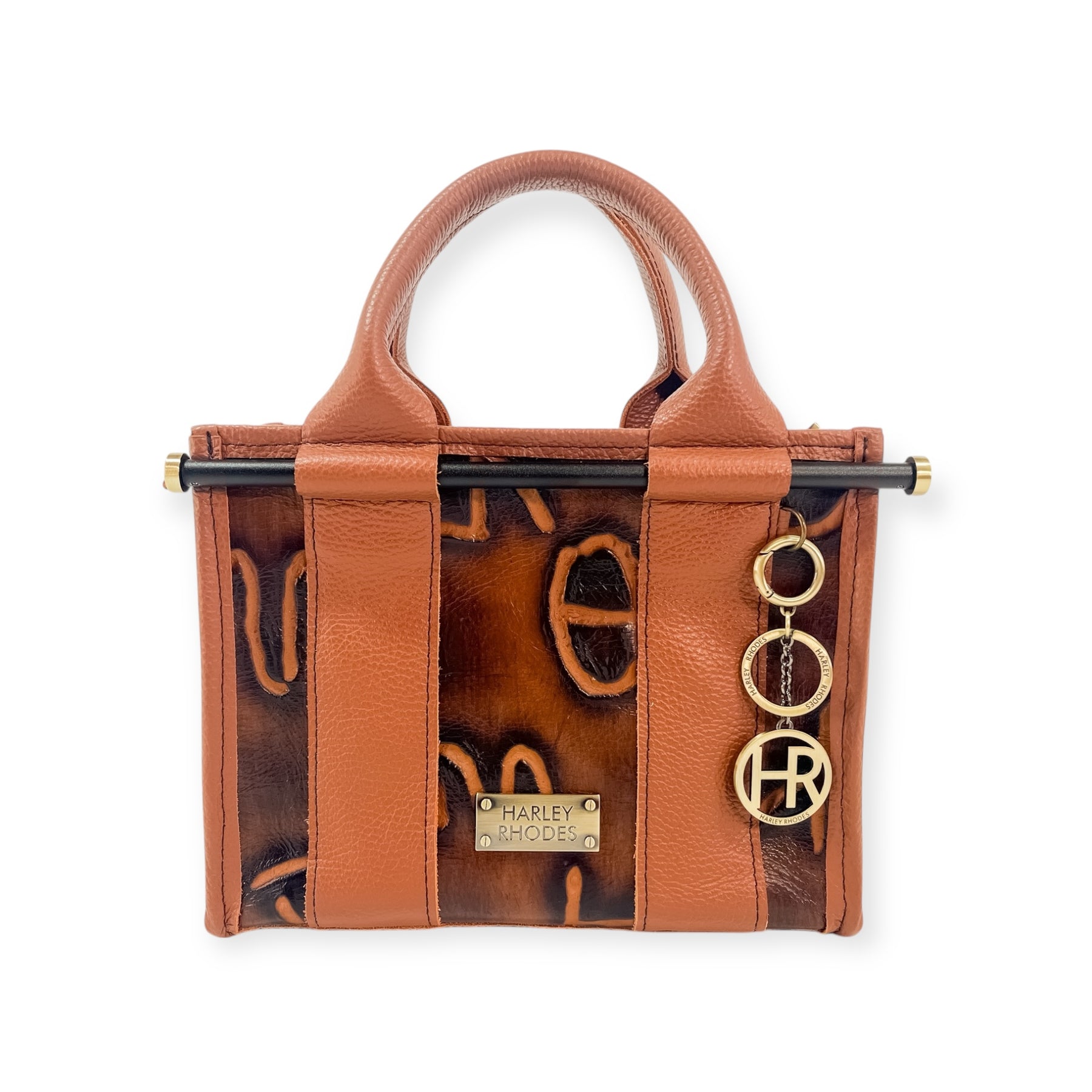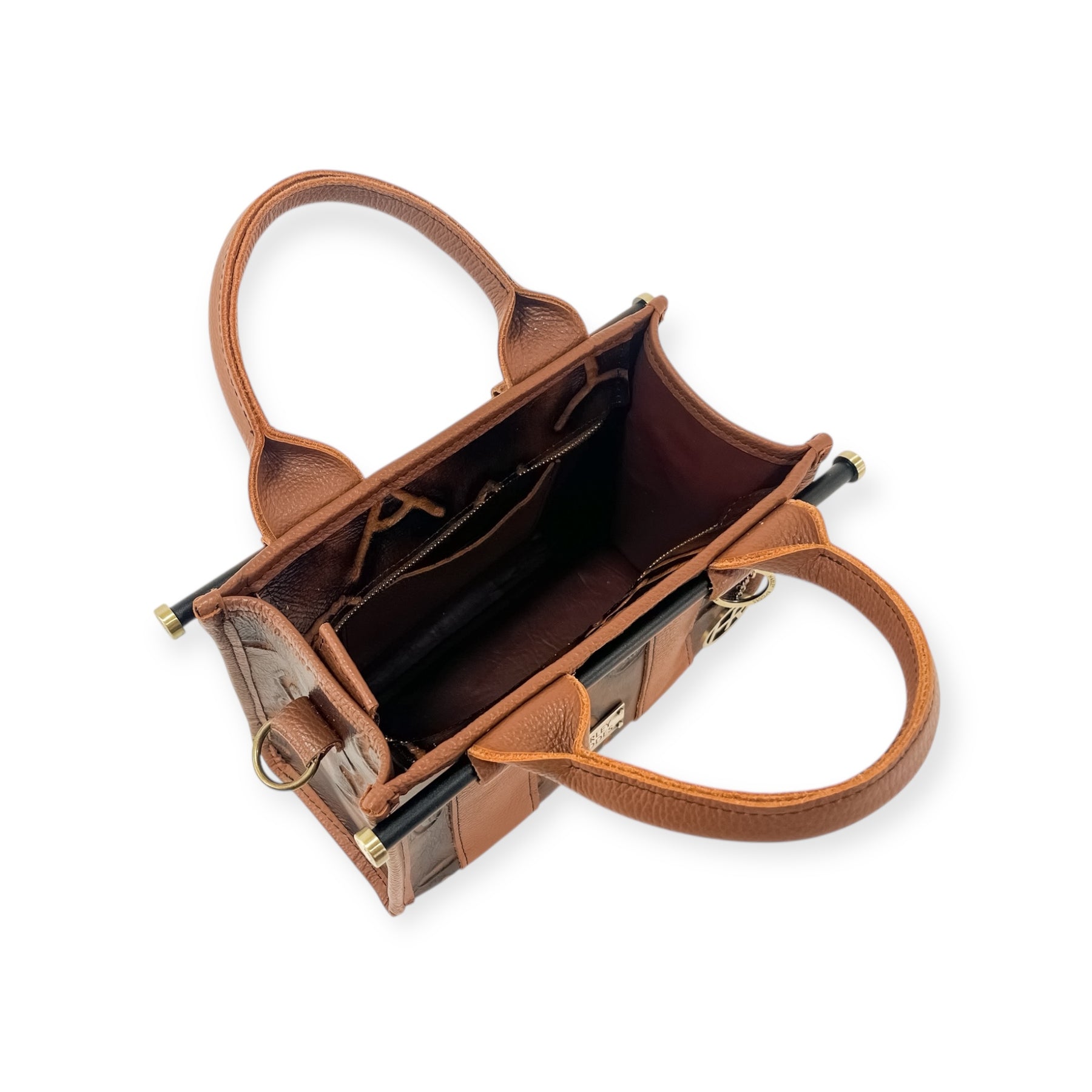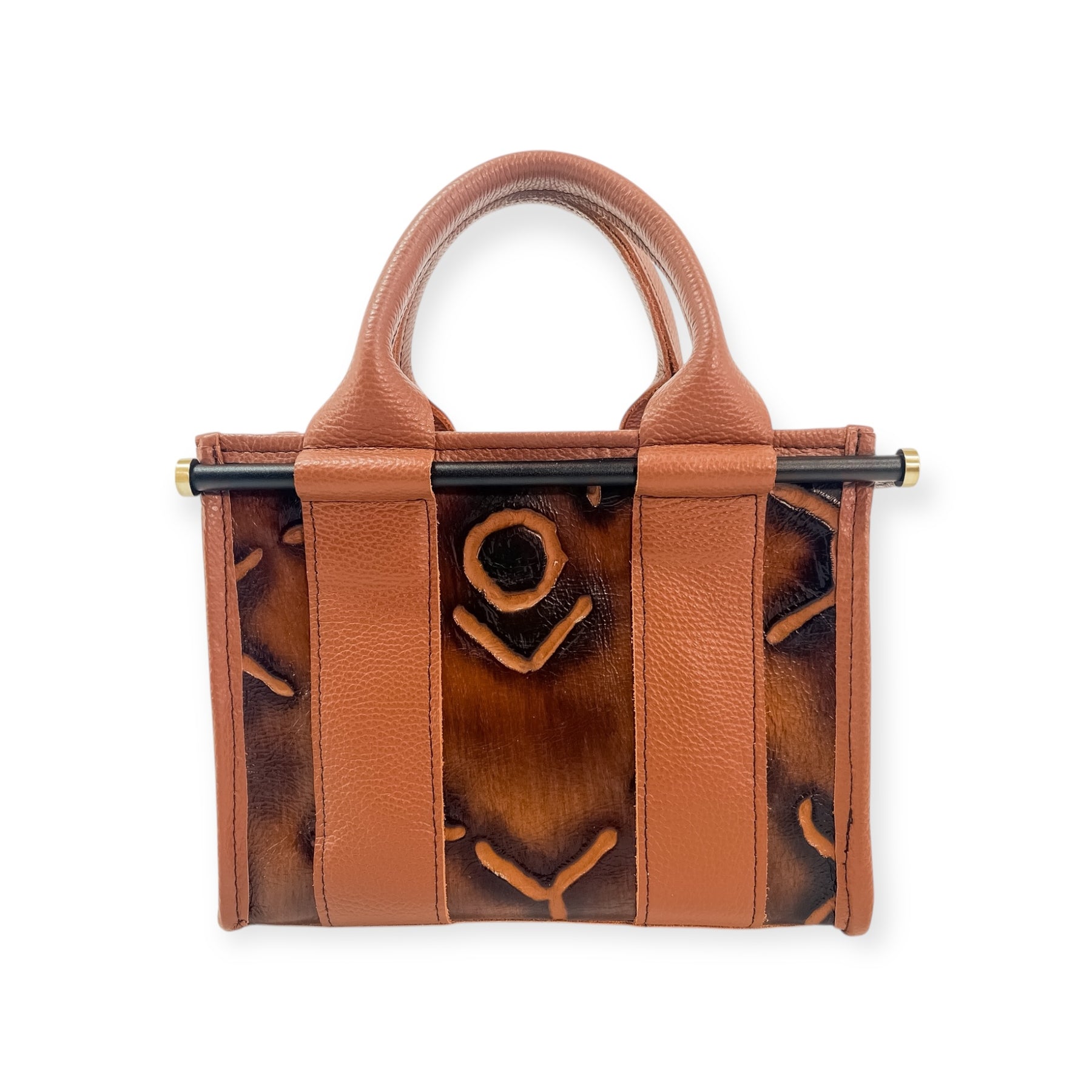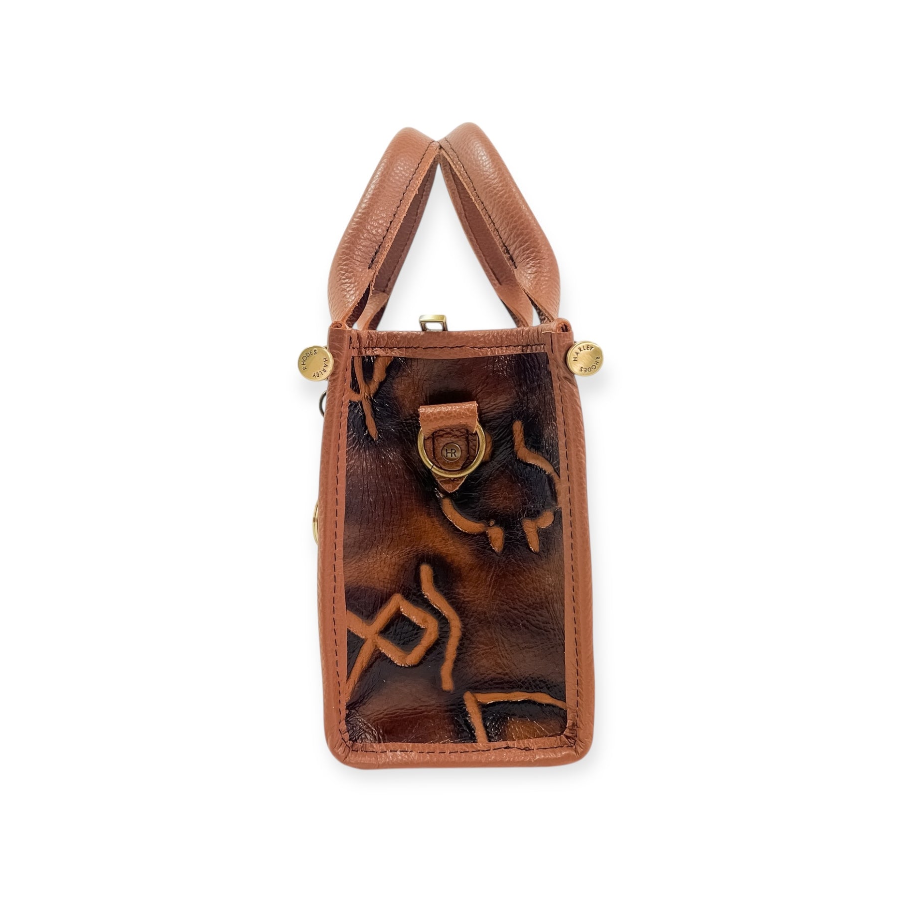 This Audrey Tote features Burnt Brands Embossed Leather front, Vinyl interior liner, with Brushed Brass hardware.