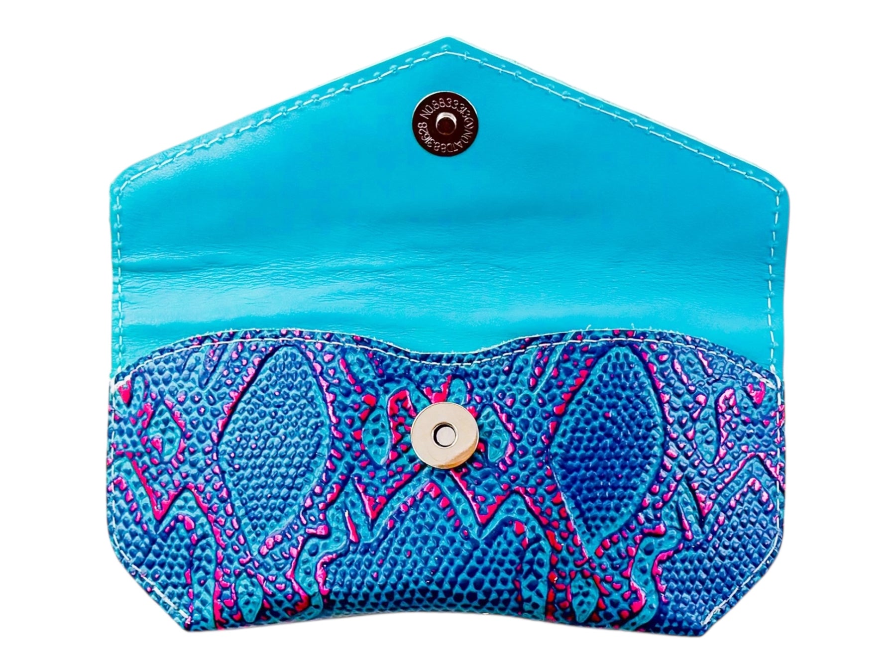This Sunglass Case features Rio Metallic Snake Print Embossed Leather front, Leather interior liner, with Polished Silver hardware.