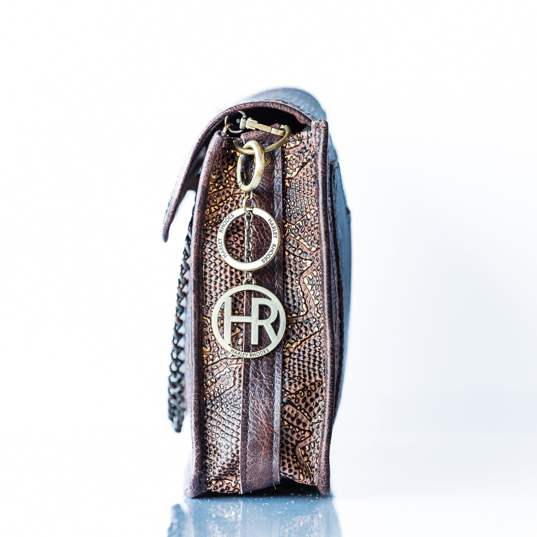 This Marilyn Crossbody features Espresso Metallic Snake Print Embossed Leather front, HarleQue Taupe RipStop interior liner, with Brushed Brass hardware.