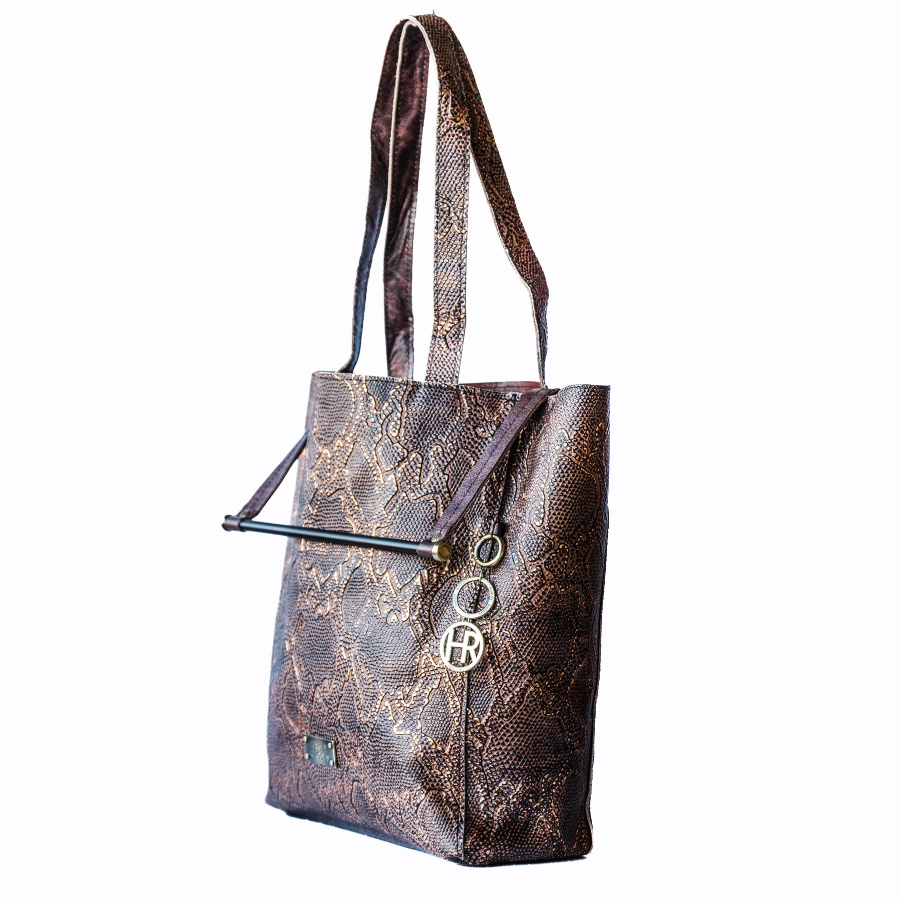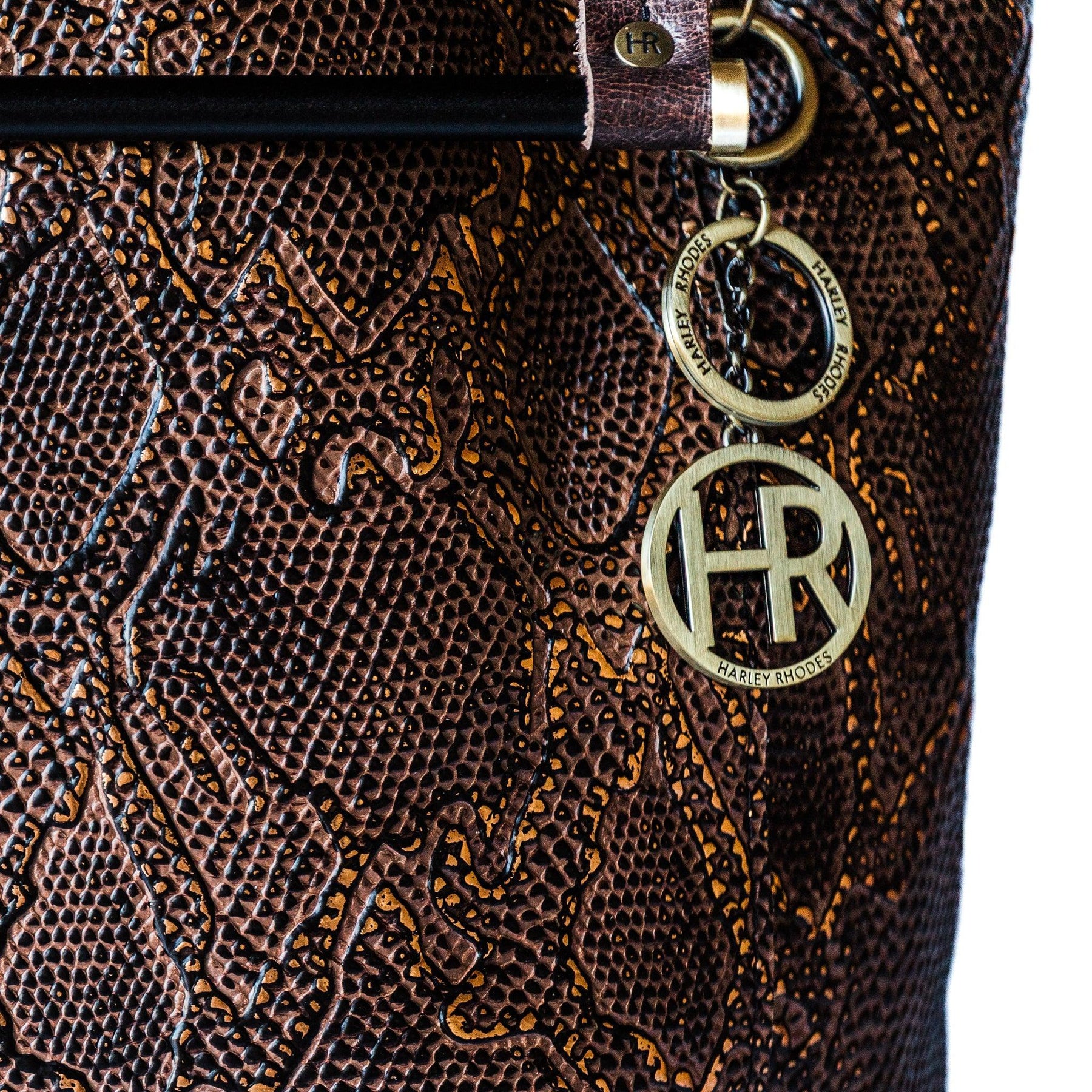 This Martha Tote features Espresso Metallic Snake Print Embossed Leather front, HarleQue Taupe Vinyl interior liner, with Brushed Brass hardware.