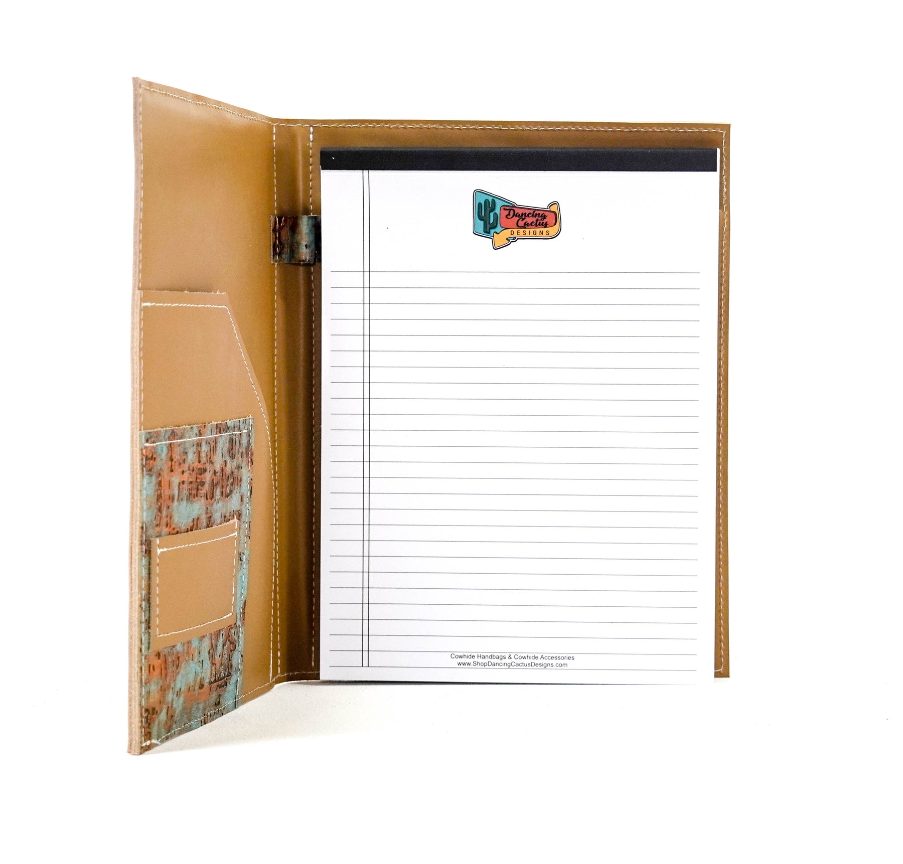 • Includes a buisness card pocket, notecard pocket and full sheet paper pocket on the interior. Pen/pencil holder in the spine.