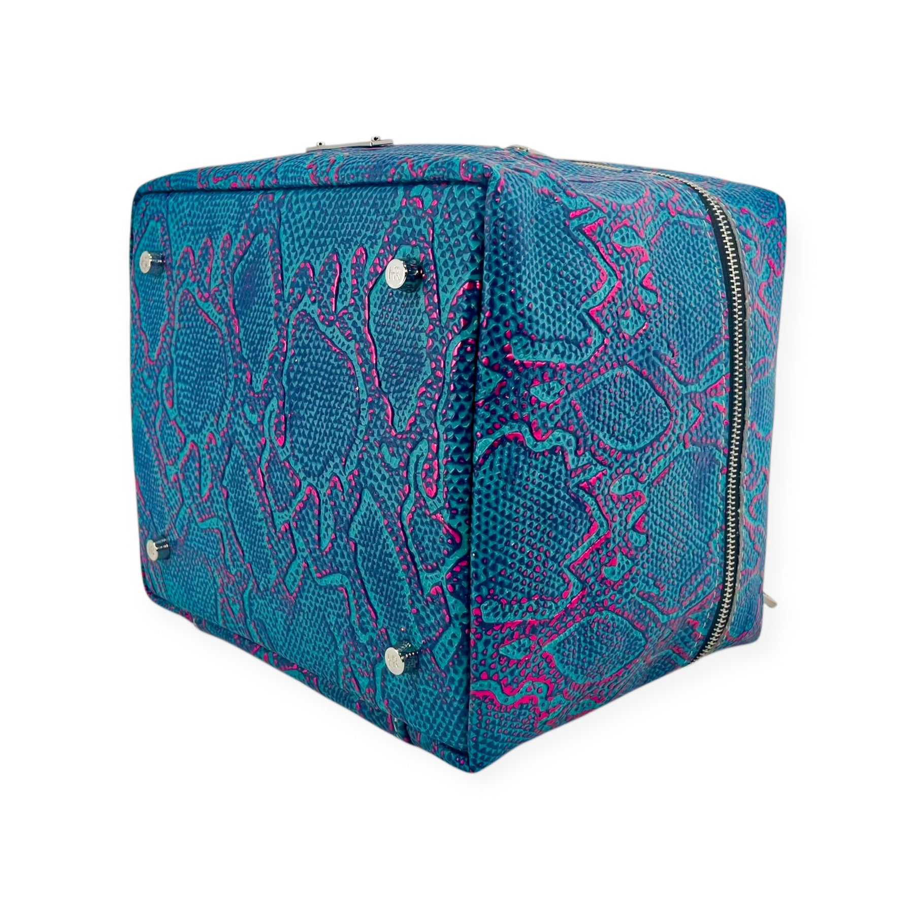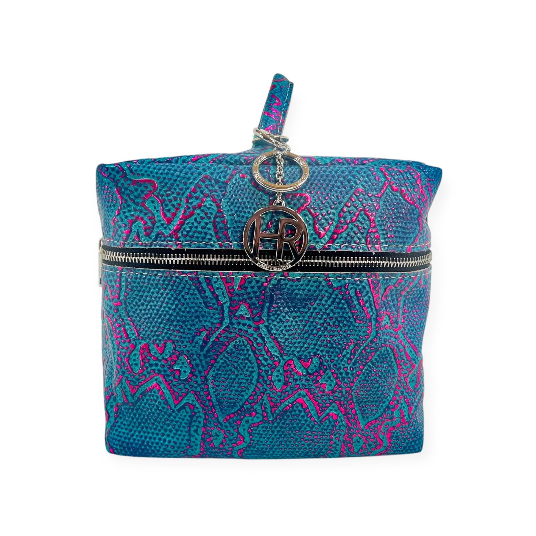 This Train Case features Rio Metallic Snake Print Embossed Leather front, HarleQue Grey RipStop interior liner, with Polished Silver hardware.