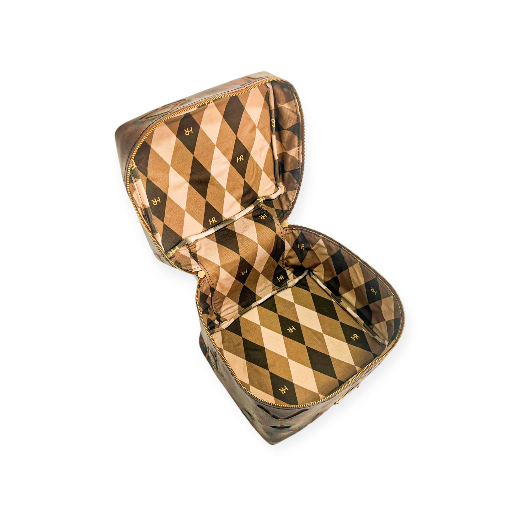 This Train Case features Burnt Brands Embossed Leather front, HarleQue Taupe RipStop interior liner, with Brushed Brass hardware.