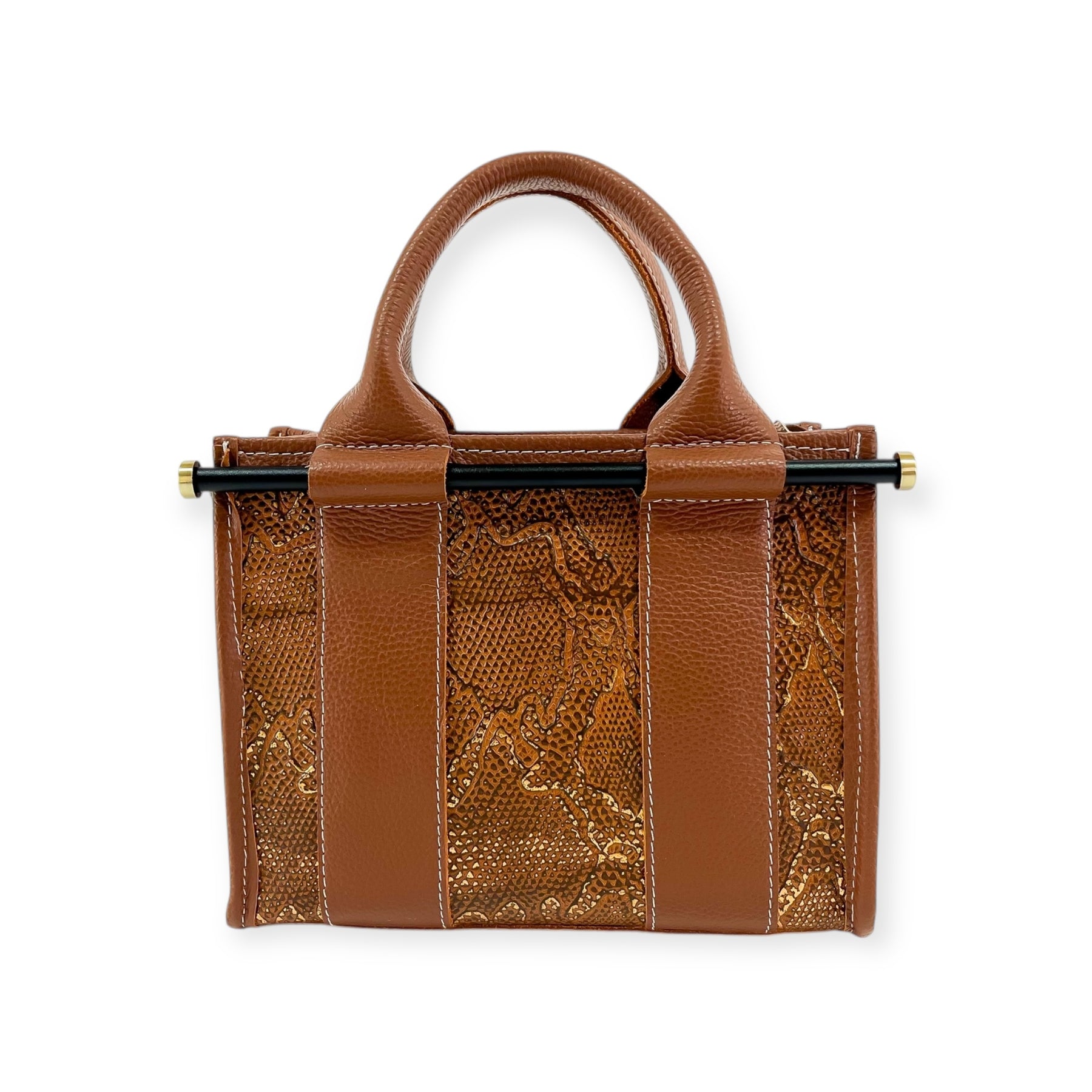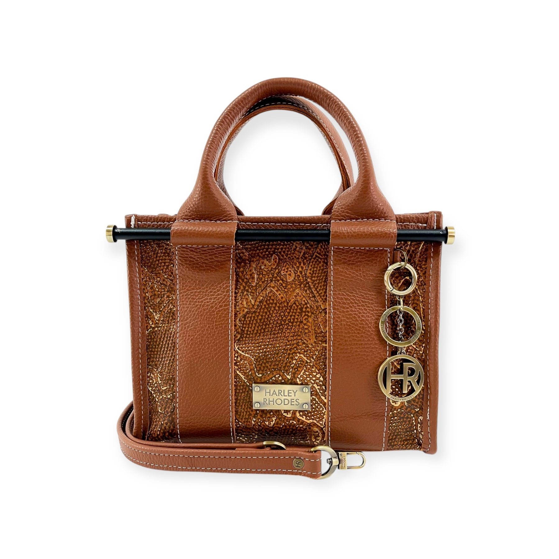 This Audrey Tote features Rust Metallic Snake Print Embossed Leather front, Vinyl interior liner, with Brushed Brass hardware.