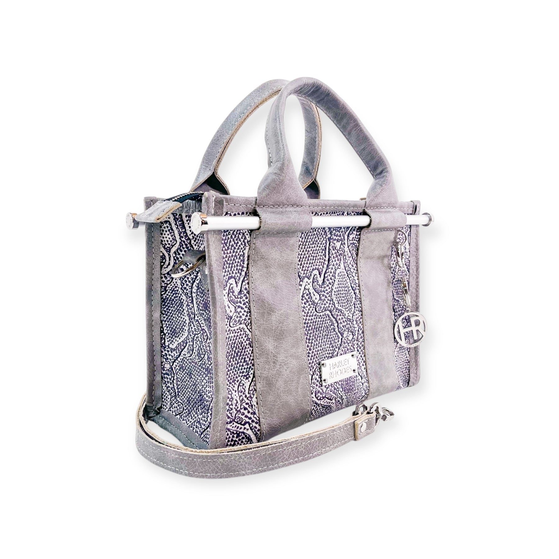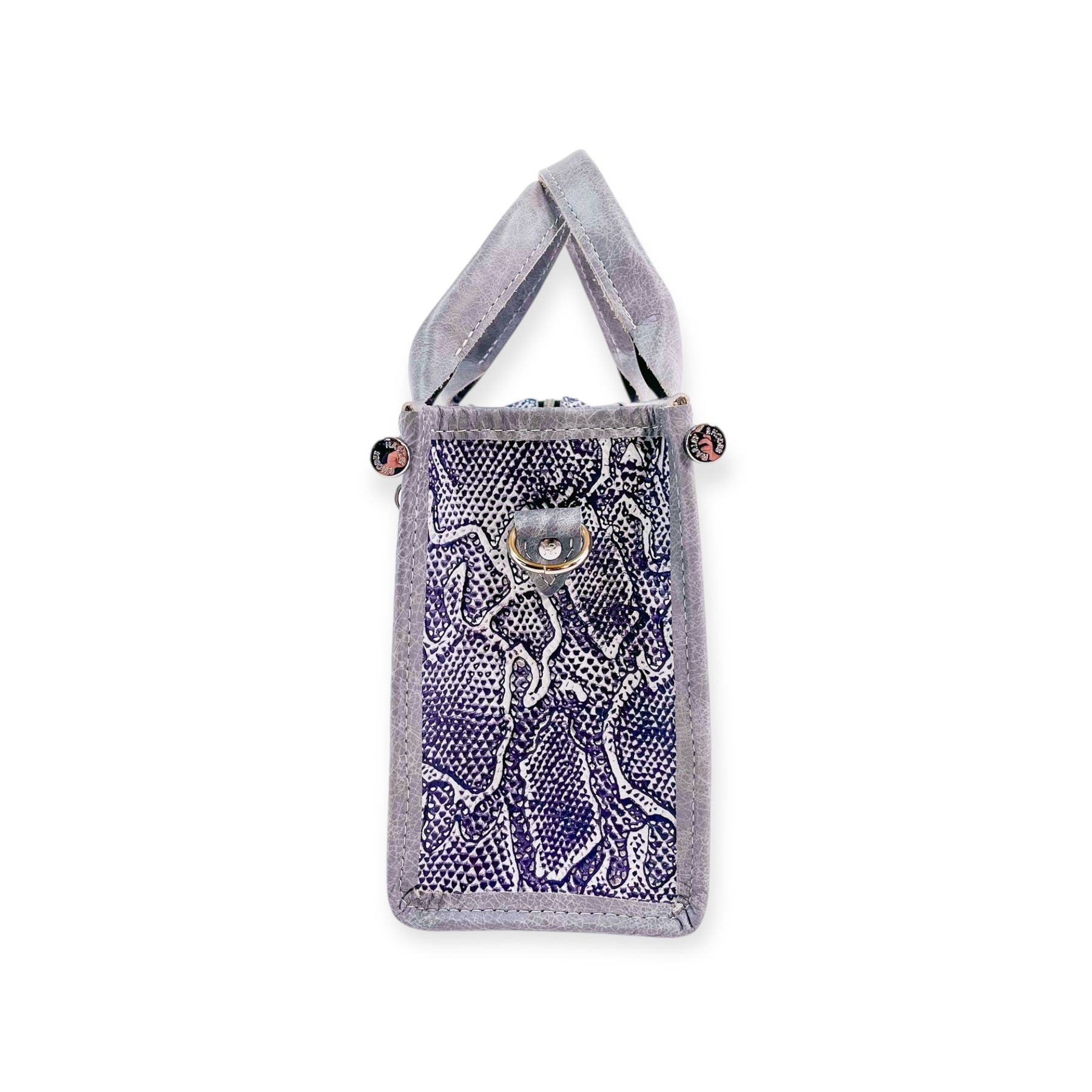 This Audrey Tote features Grey Metallic Snake Print Embossed Leather front, Vinyl interior liner, with Polished Silver hardware.