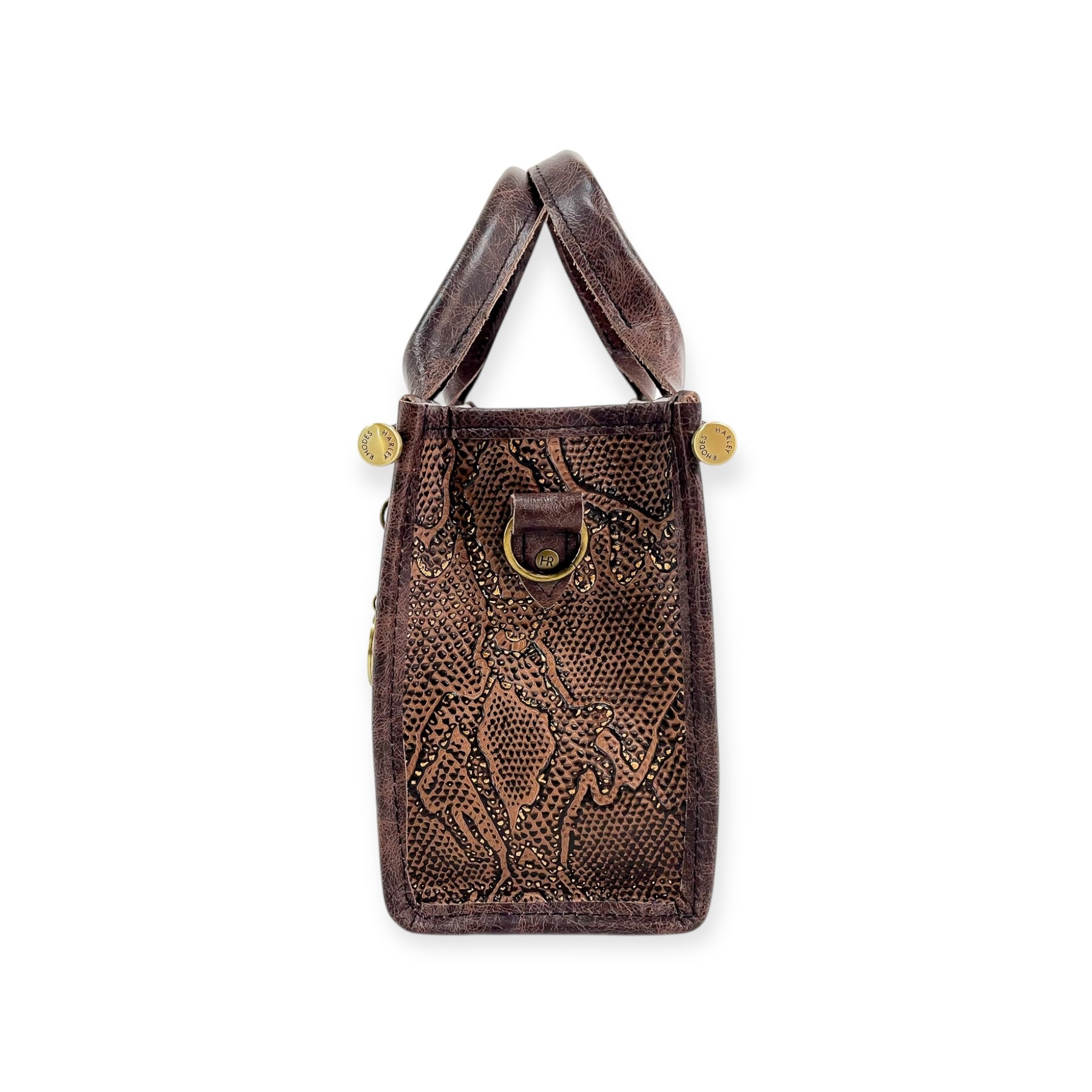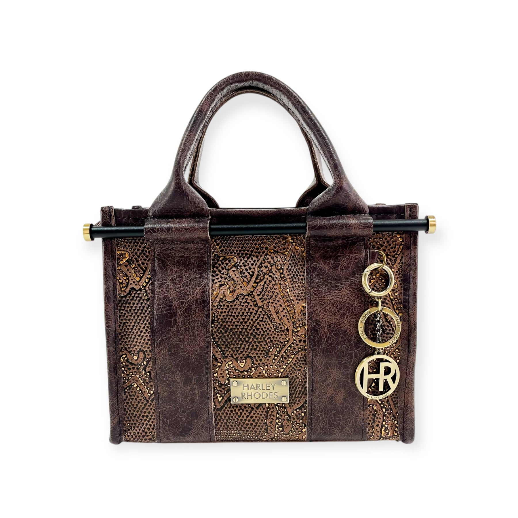 This Audrey Tote features Espresso Metallic Snake Print Embossed Leather front, Vinyl interior liner, with Brushed Brass hardware.