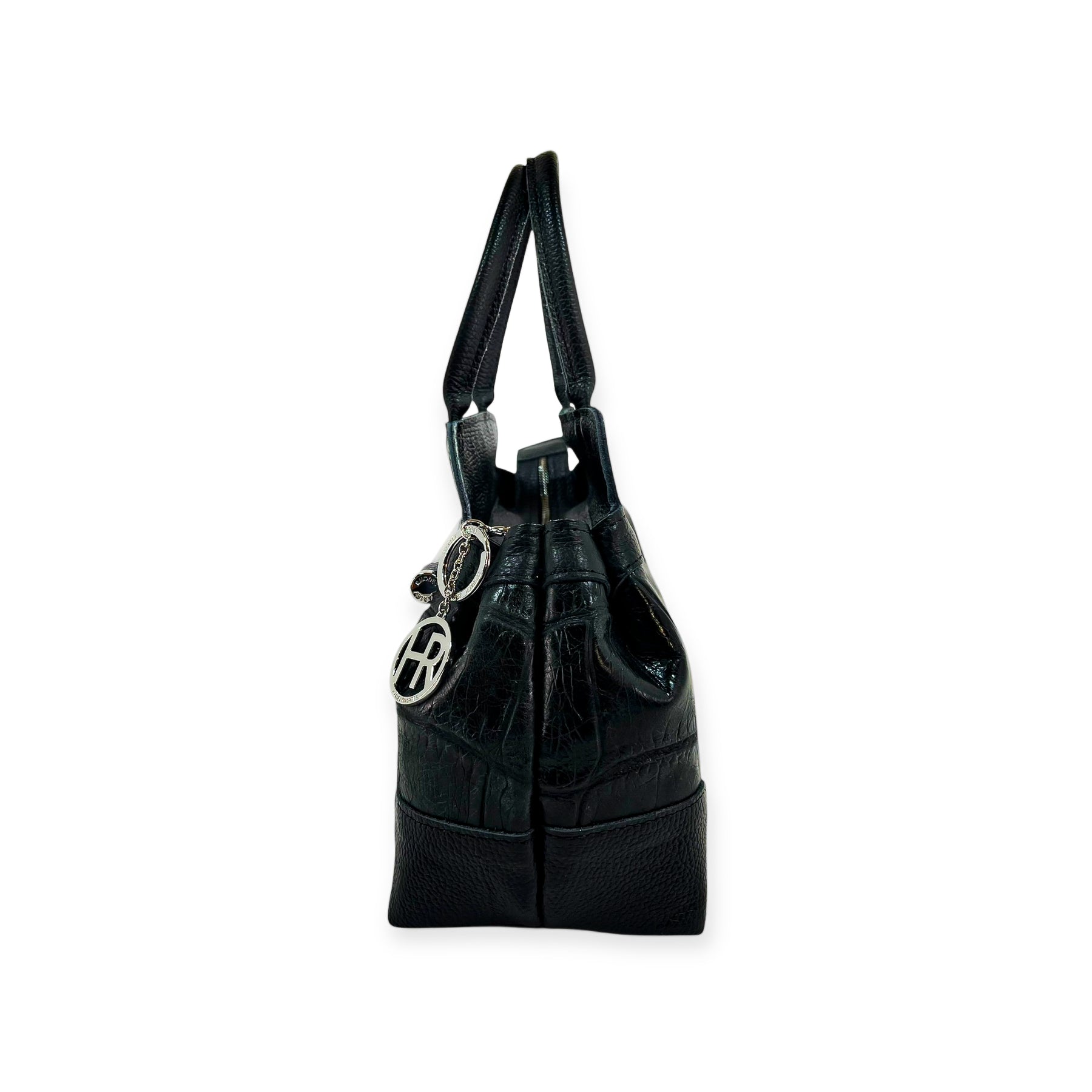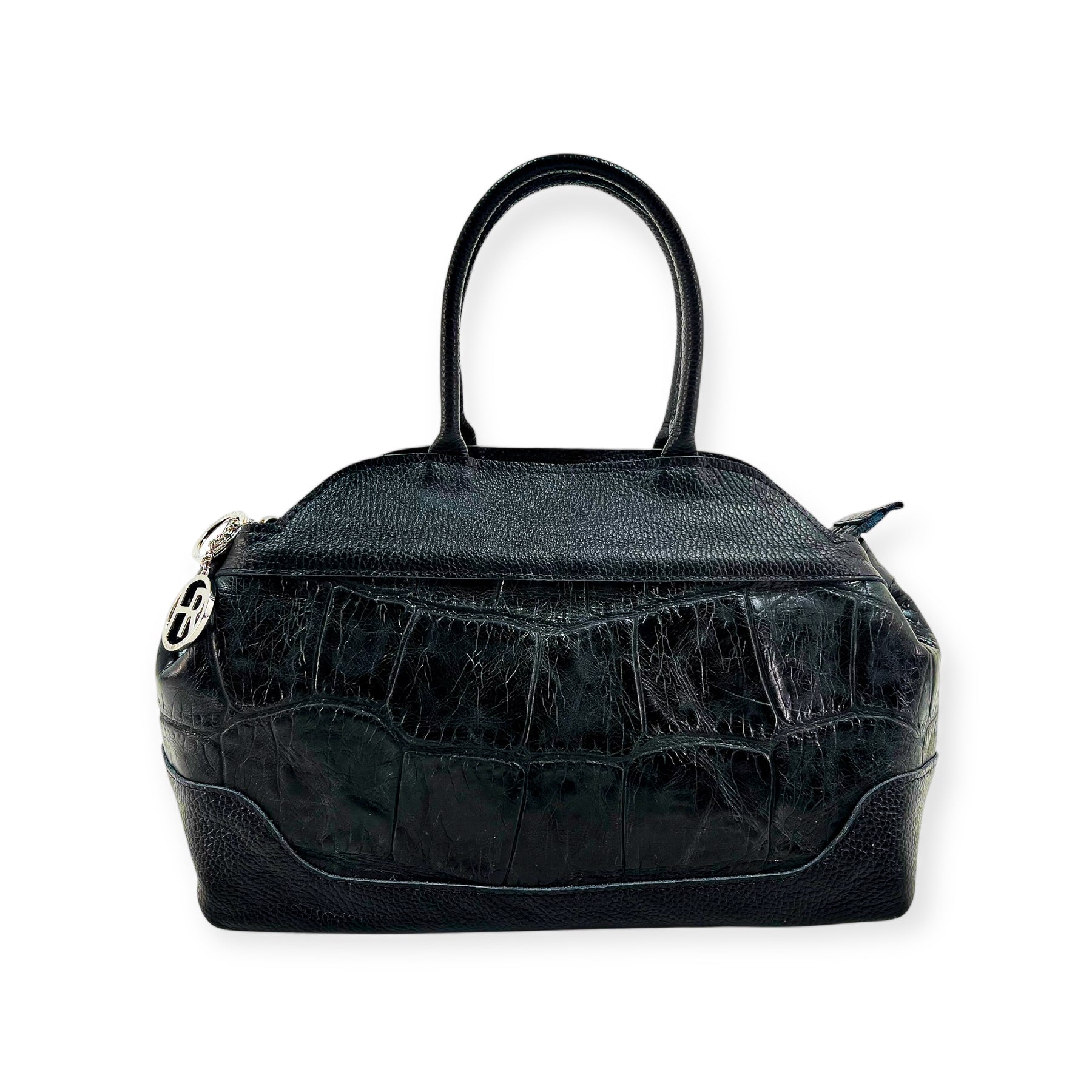 This This Barbara Handbag features Onyx Jumbo Croc Embossed Leather front, HarleQue Grey Micro Suede interior liner, with Polished Silver hardware.
