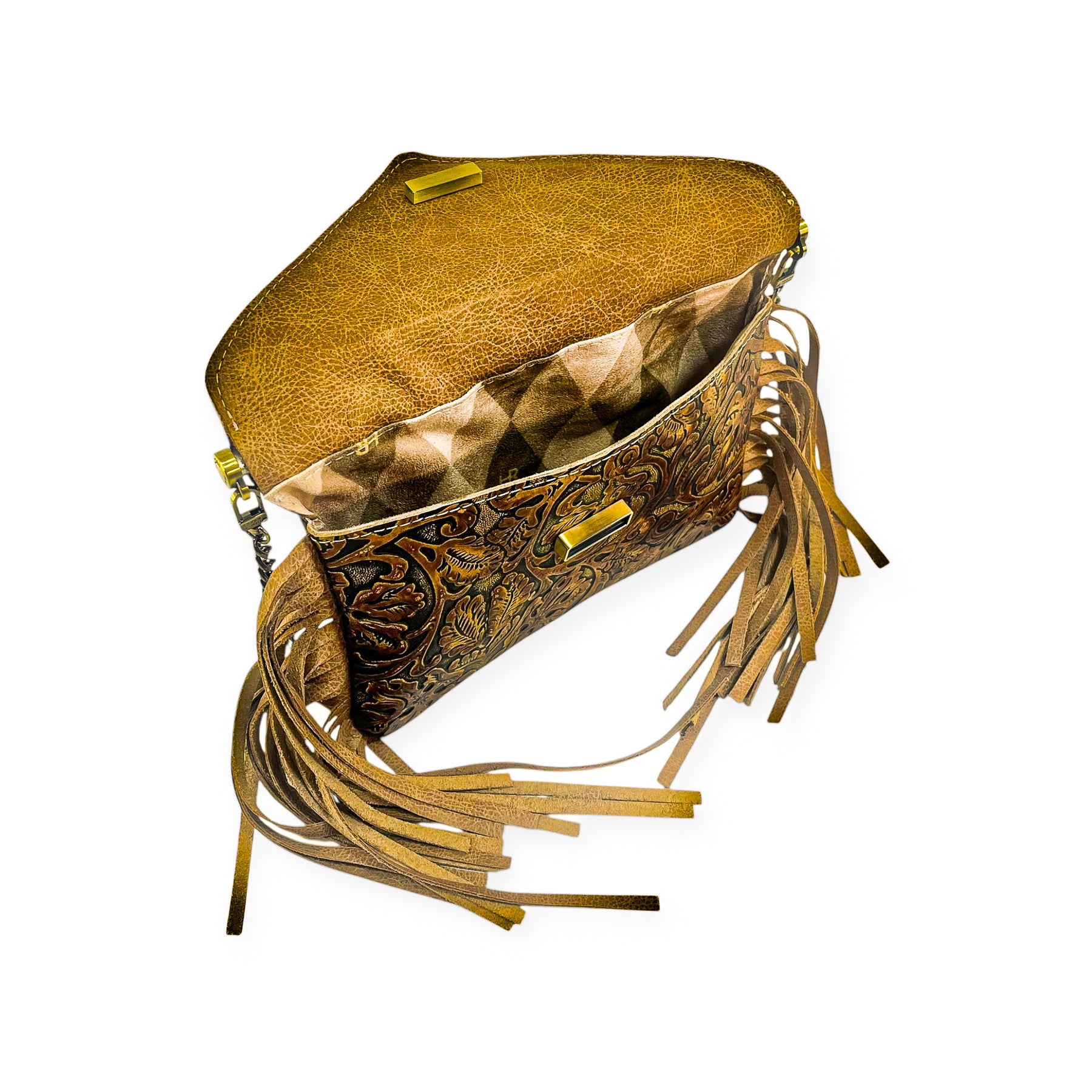 This Betty Envelope Clutch features Wyoming Tool Embossed Leather front, HarleQue Taupe Micro Suede interior liner and Fringe, with Brushed Brass hardware.