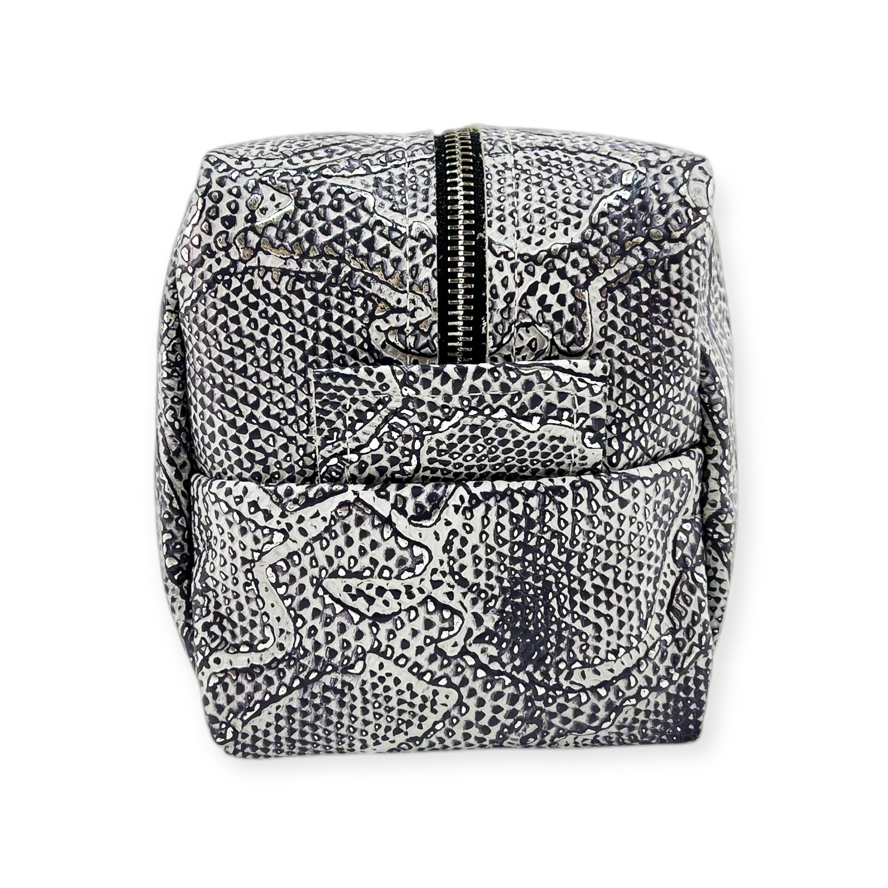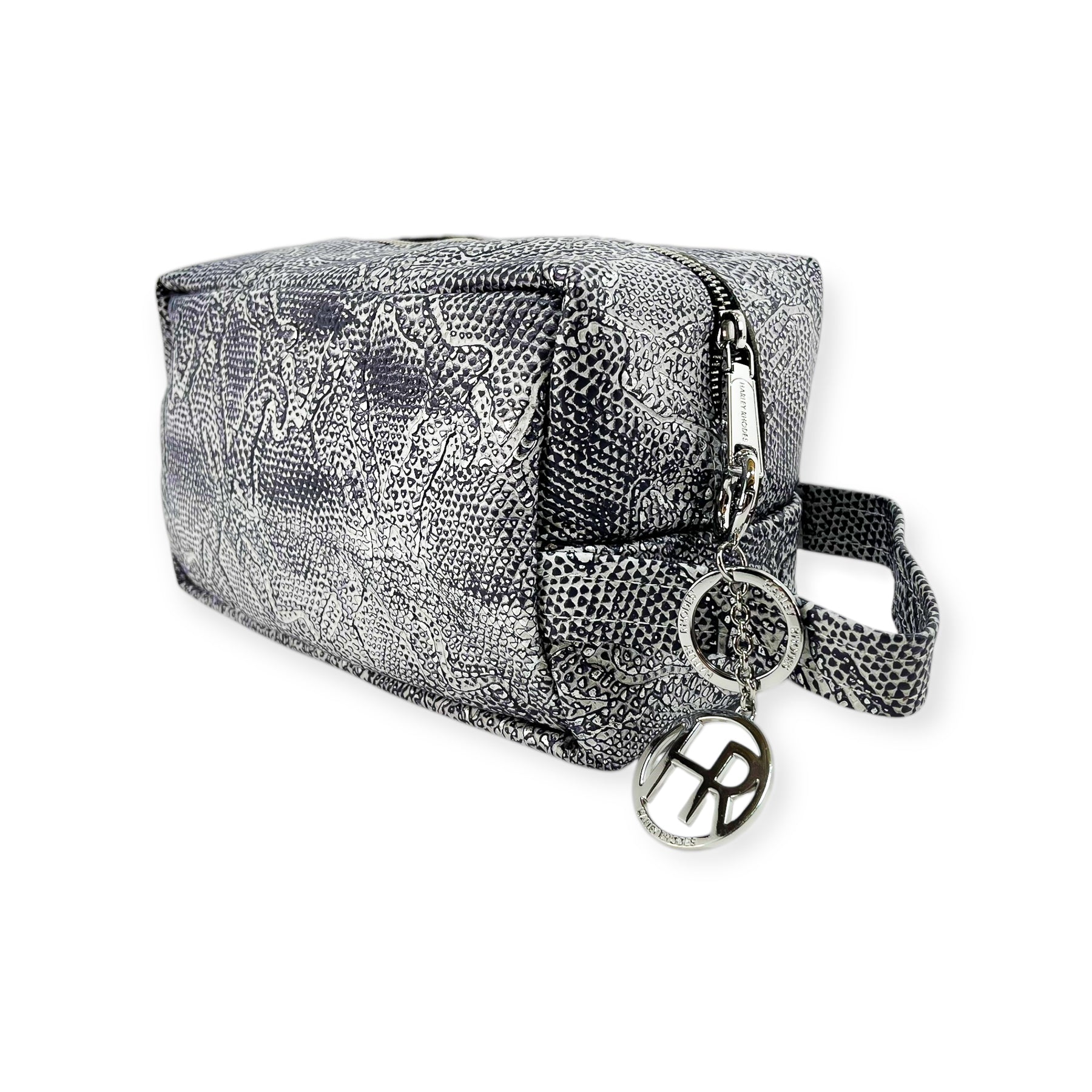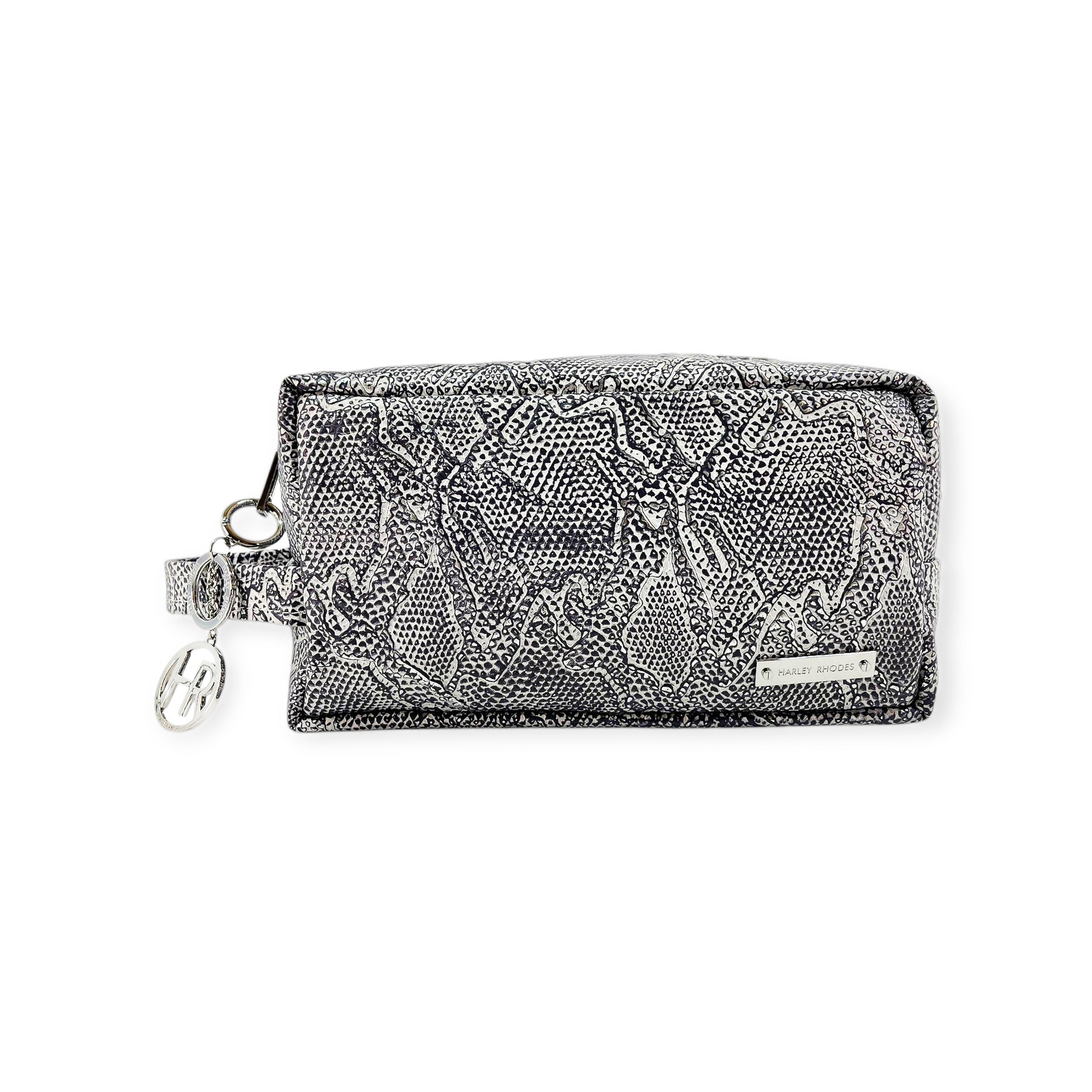 This Dopp Kit features Grey Metallic Snake Print Embossed Leather front, HarleQue Grey RipStop interior liner, with Polished Silver hardware.