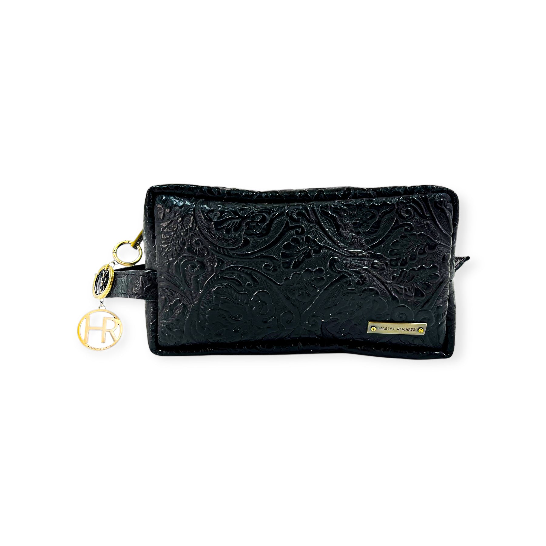 This Dopp Kit features Onyx Tool Embossed Leather front, HarleQue Taupe RipStop interior liner, with Brushed Brass hardware.